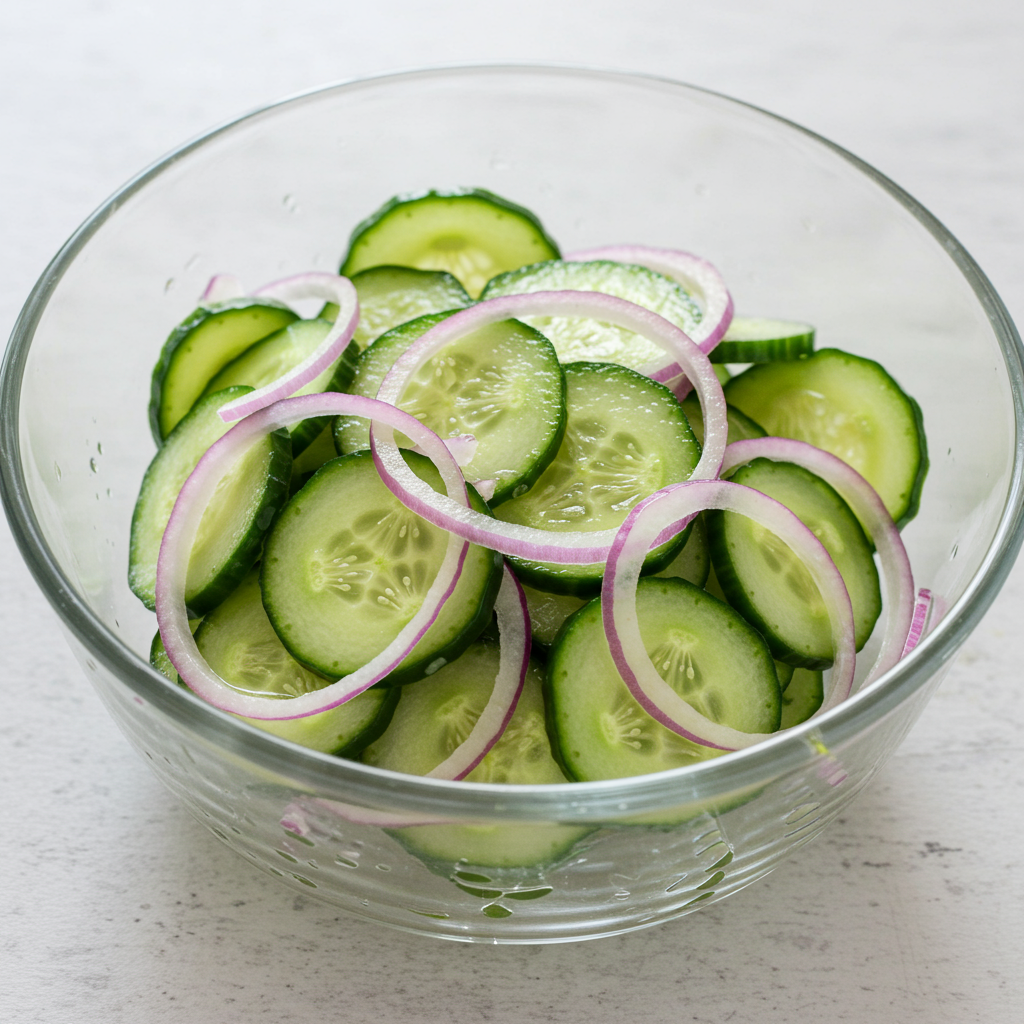 - Slice cucumbers and onions thinly and place them in a bowl.