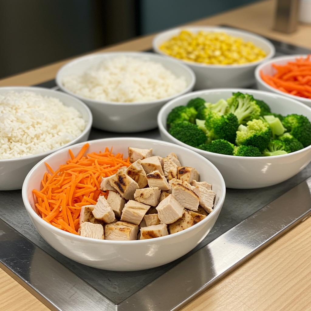 - Let everyone build their own bowl, starting with rice and chicken, then adding toppings as they like.