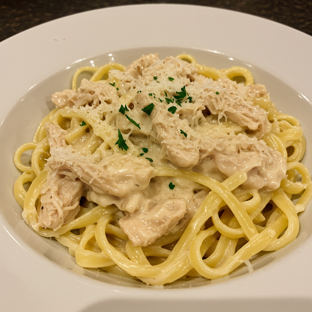 - Mix pasta, chicken, and Alfredo sauce in a large pot over low heat.
