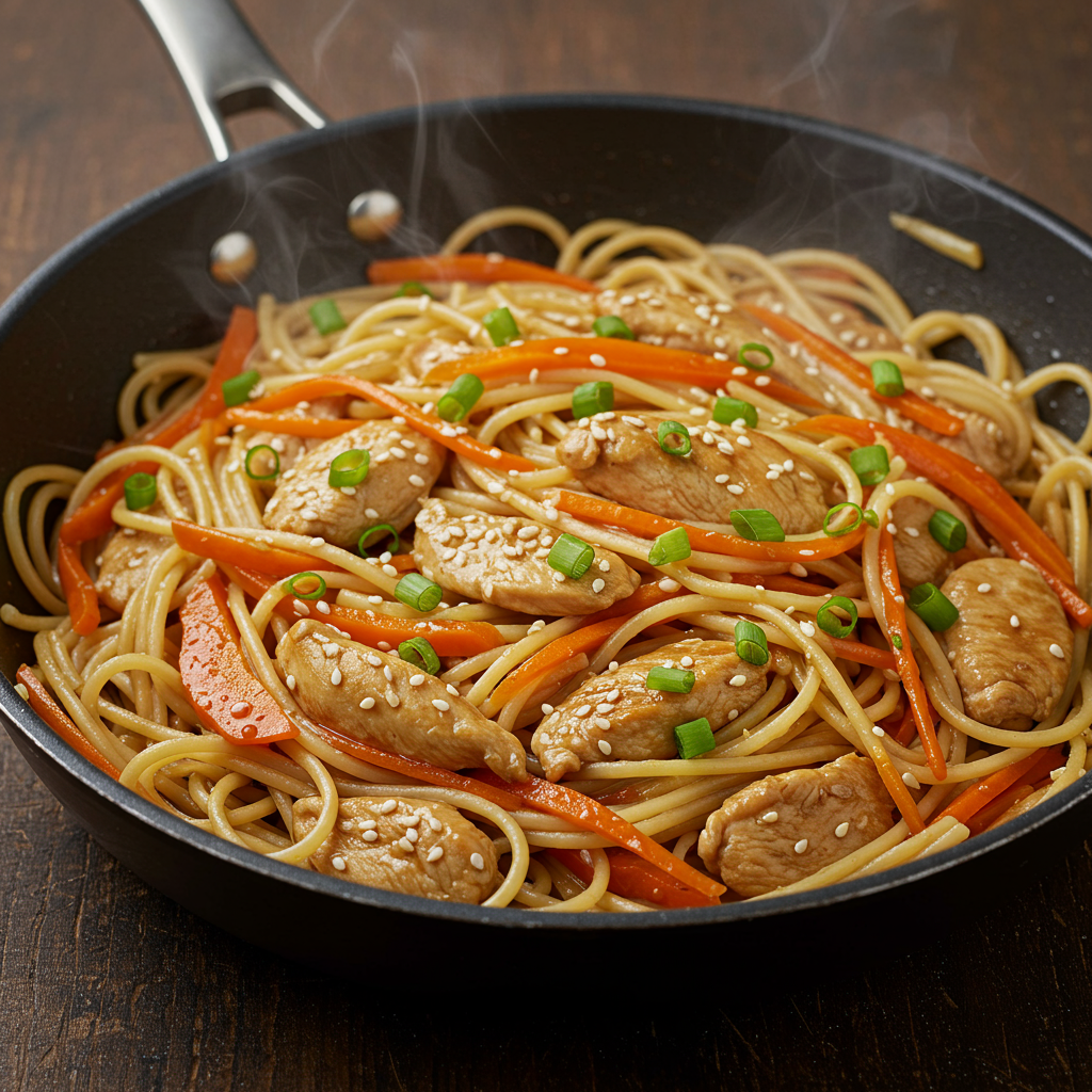 - Stir in noodles, soy sauce, honey, and garlic powder. Toss to coat and heat through.