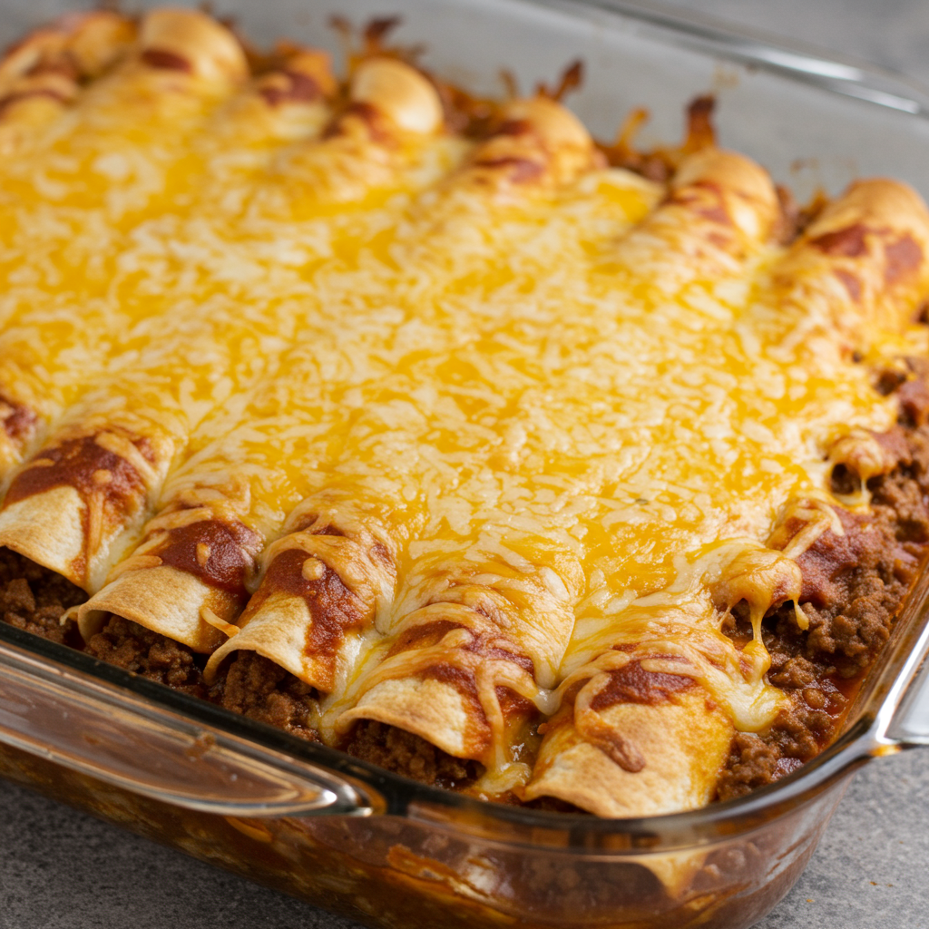- In a baking dish, layer tortillas, beef, sauce, and cheese. Repeat layers.
