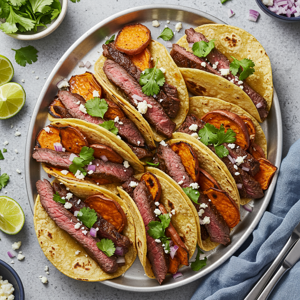 These flavor-packed tacos combine marinated beef with the natural sweetness of grilled sweet potatoes creating a balanced and nutritious meal that’s perfect for casual dining.