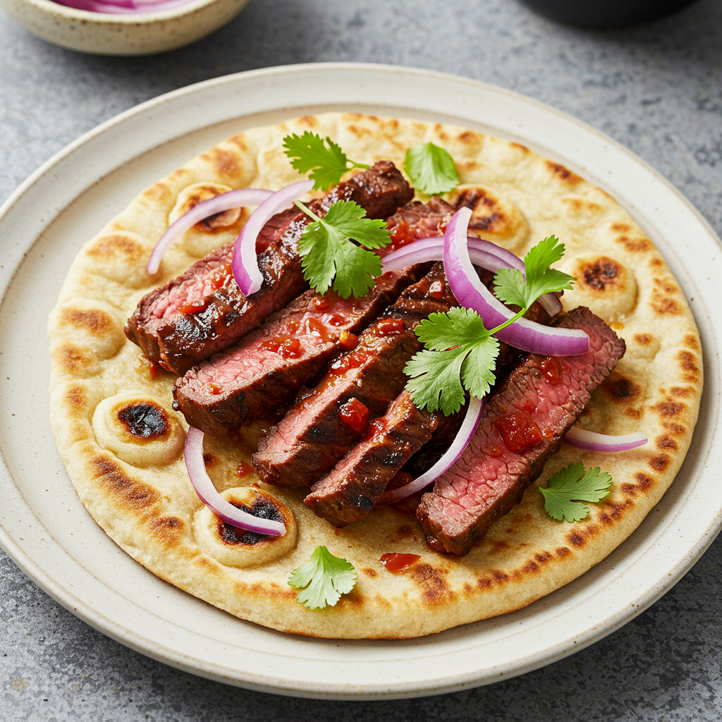 Transform your grill into a fusion kitchen with this spicy and aromatic combination that pairs perfectly marinated skirt steak with warm pillowy naan bread.