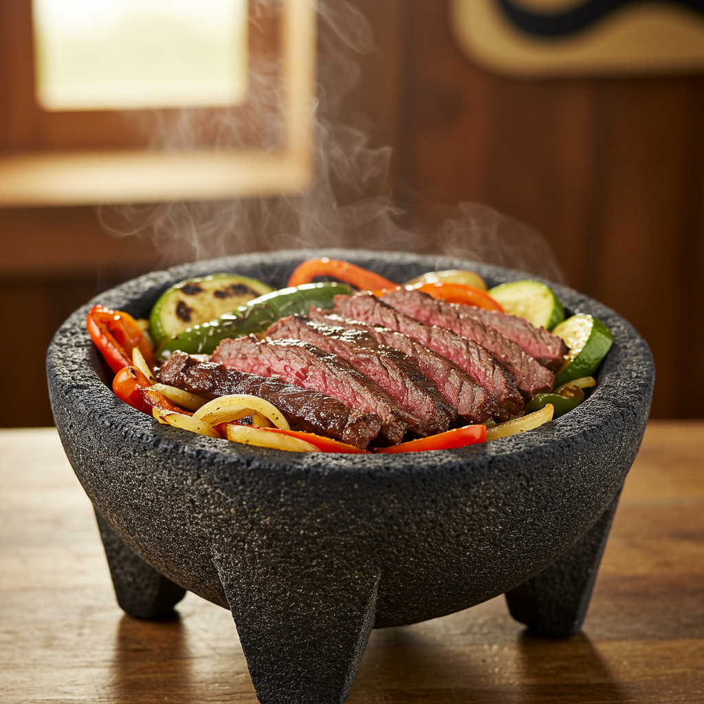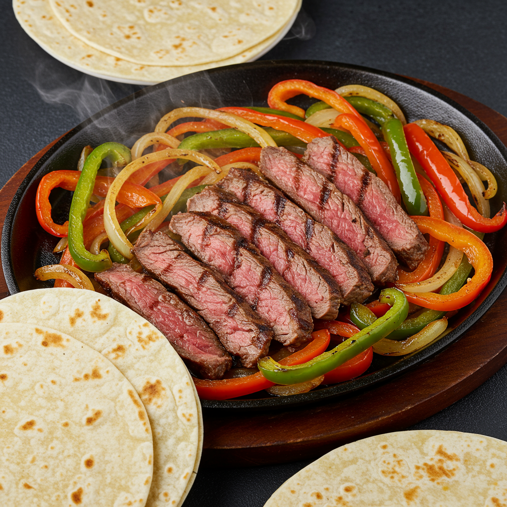 Create an interactive dining experience with sizzling fajitas featuring perfectly grilled beef and colorful vegetables.