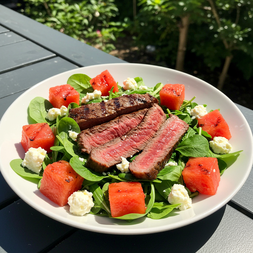 This refreshing summer combination pairs the sweetness of grilled watermelon with savory steak for a unique and satisfying meal.