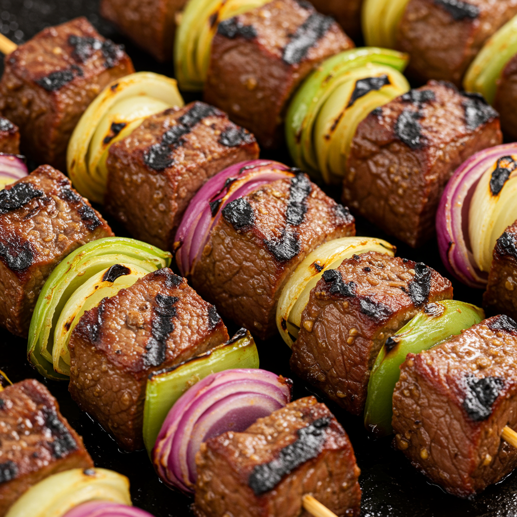 These flavor-packed kabobs showcase the fifth taste with a combination of grilled beef and various onions that create incredible depth.