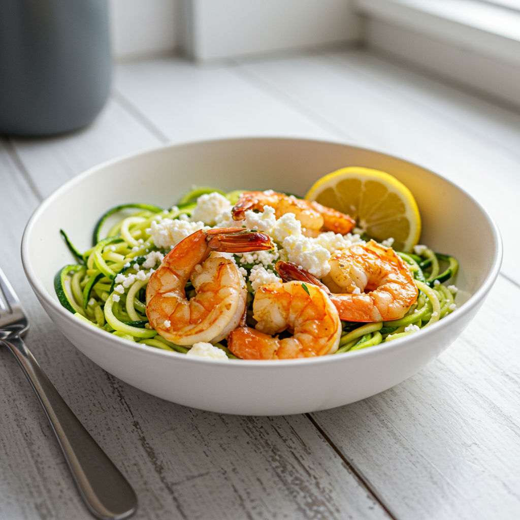 - Serve shrimp over noodles, sprinkle with feta, and drizzle with lemon juice.