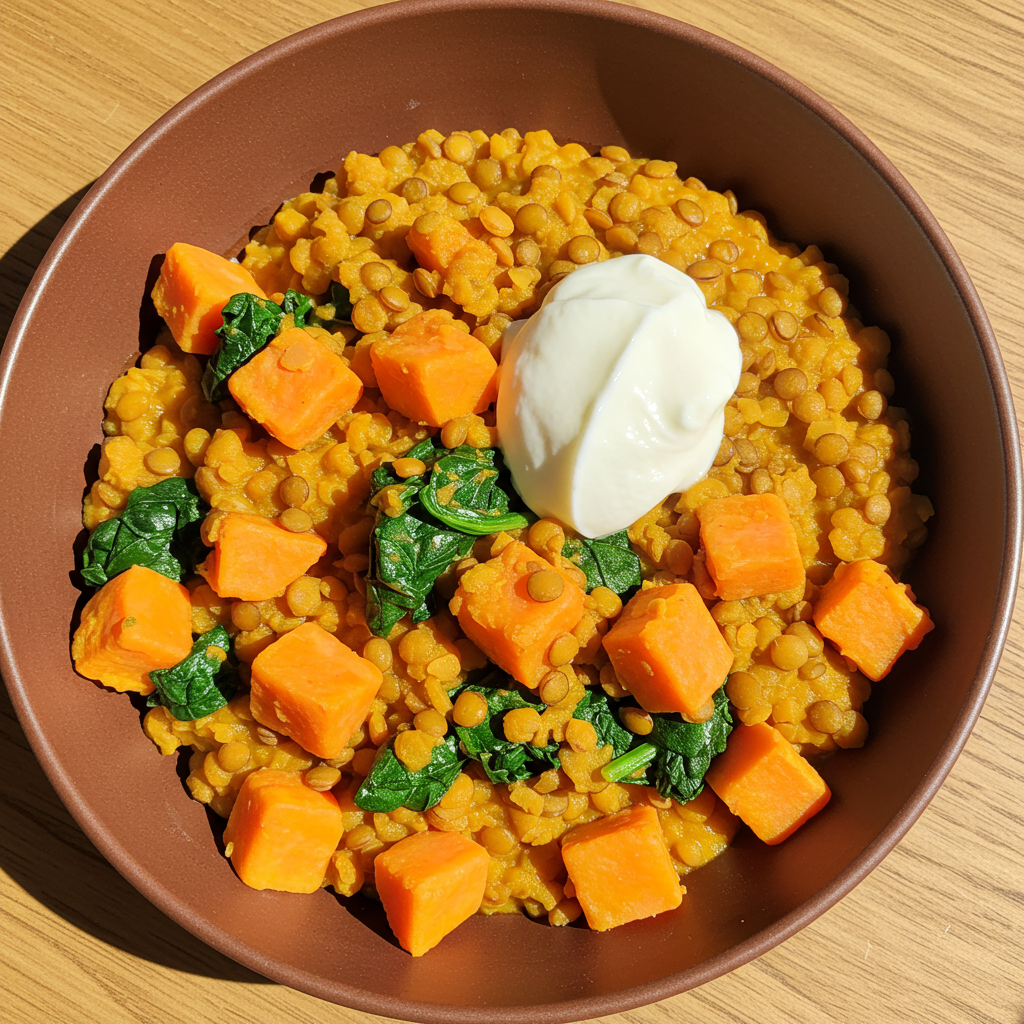 Why it’s aesthetic: Deep orange lentils, green spinach, and golden sweet potatoes—total color explosion.