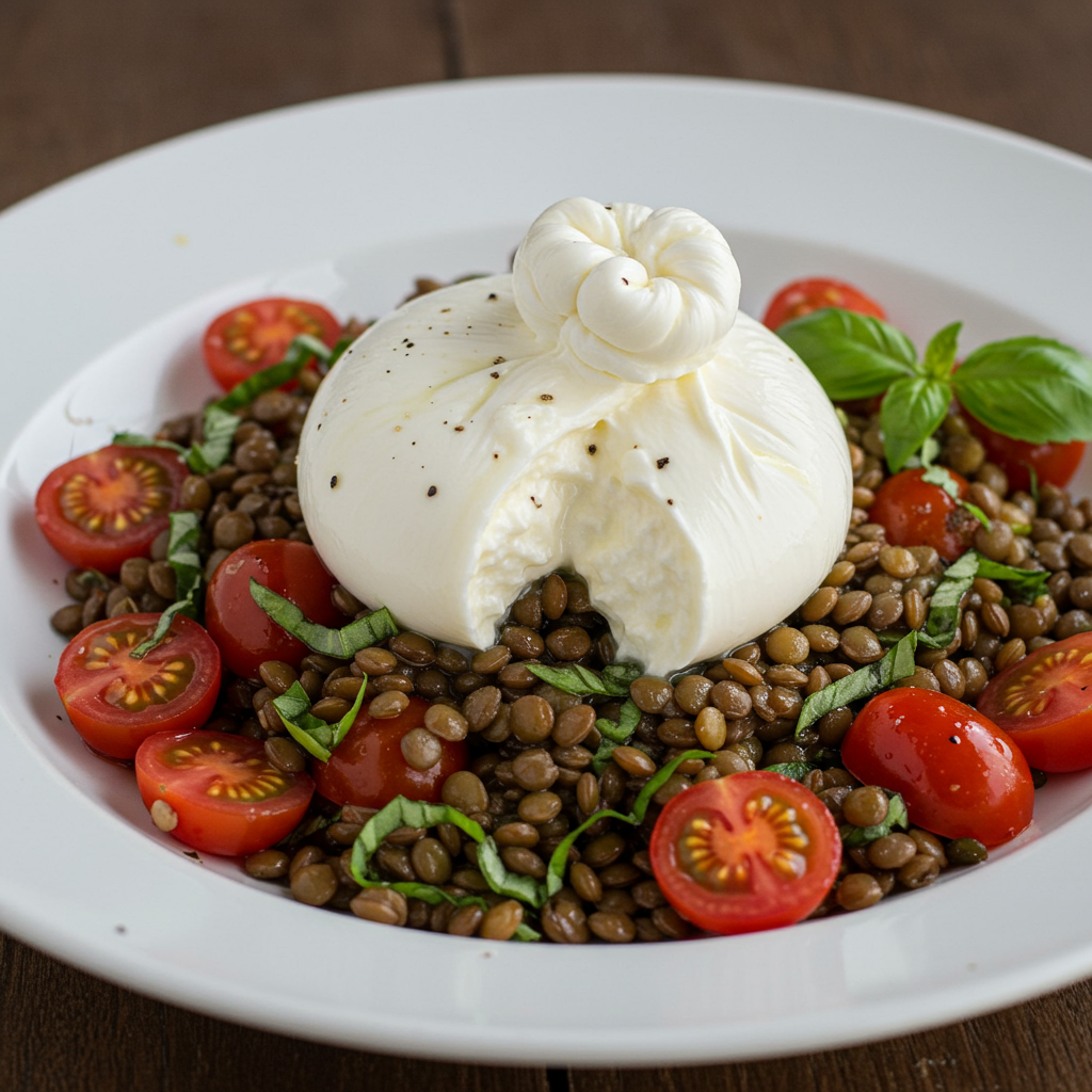 Why it’s aesthetic: Creamy burrata, earthy lentils, and fresh herbs—fancy enough for a dinner party.