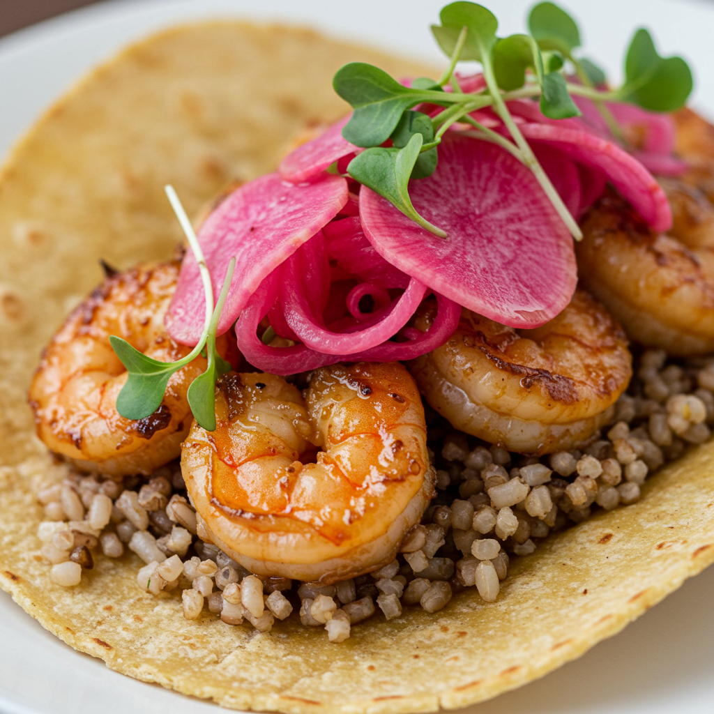 - Assemble tacos with shrimp pickled radishes and microgreens.