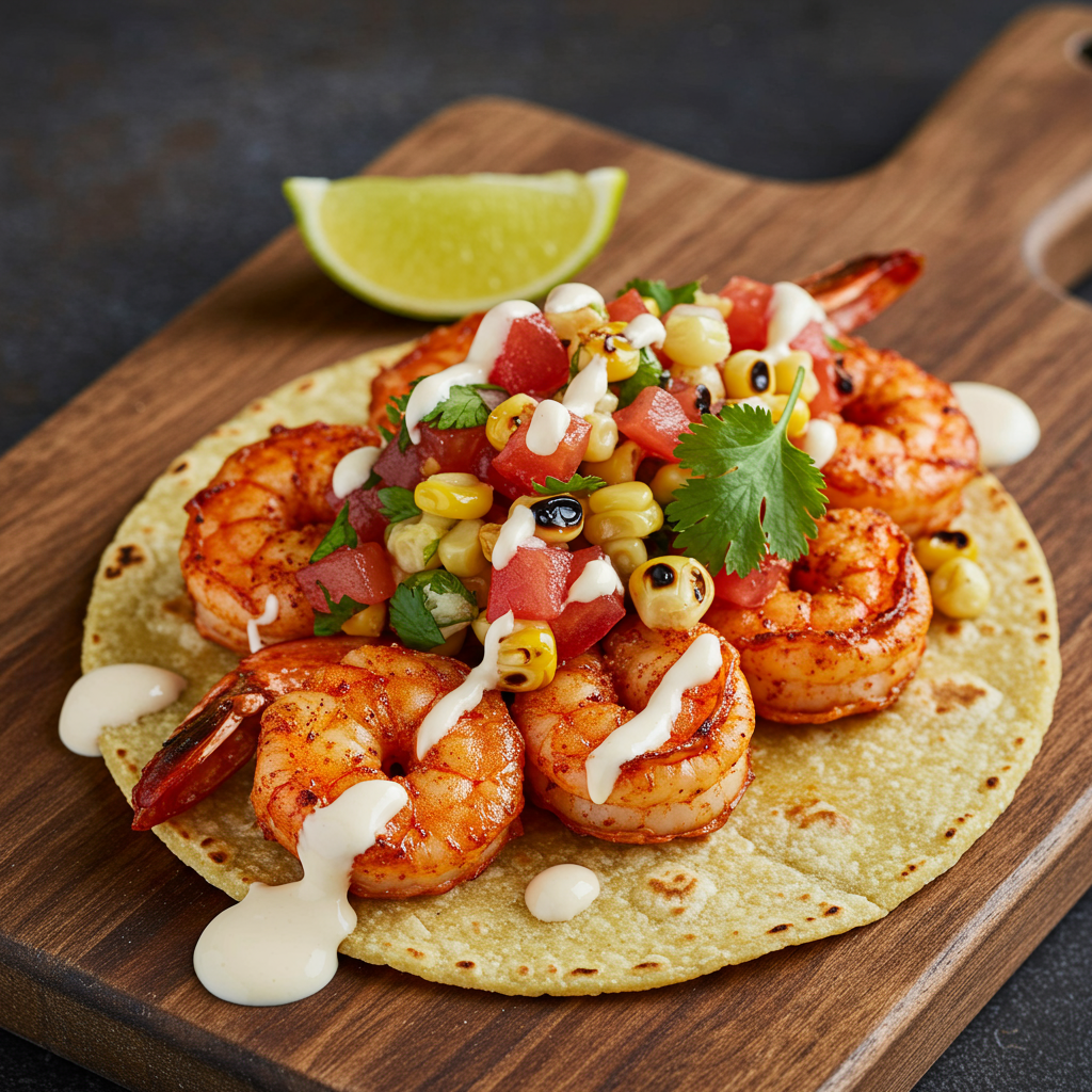 32. Fire-Roasted Shrimp Tacos with Charred Corn Salsa