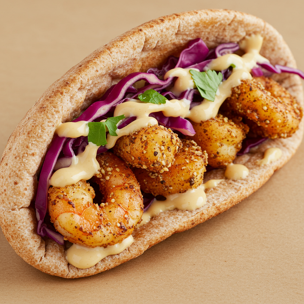 - Stuff pitas with cabbage shrimp and tahini drizzle.