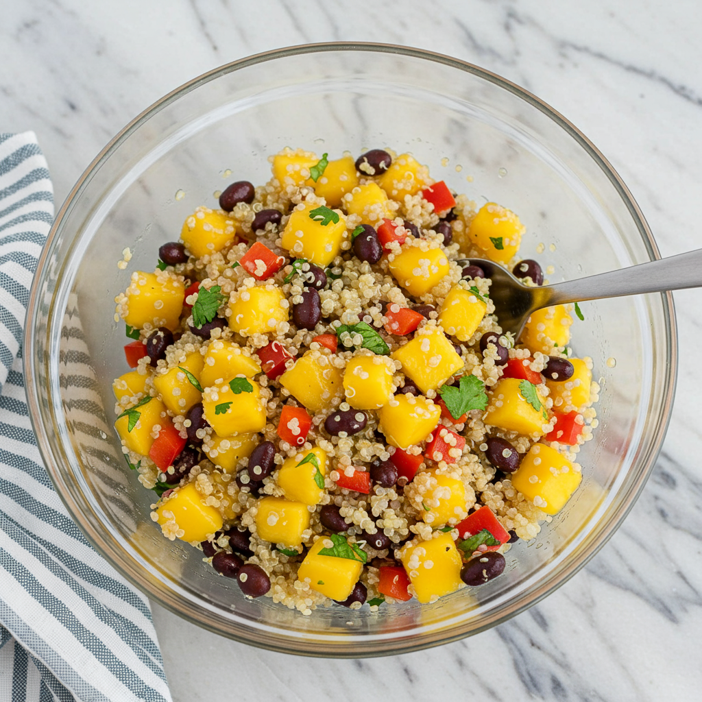 - Combine ingredients: In a large bowl mix quinoa black beans mango bell pepper red onion and cilantro.