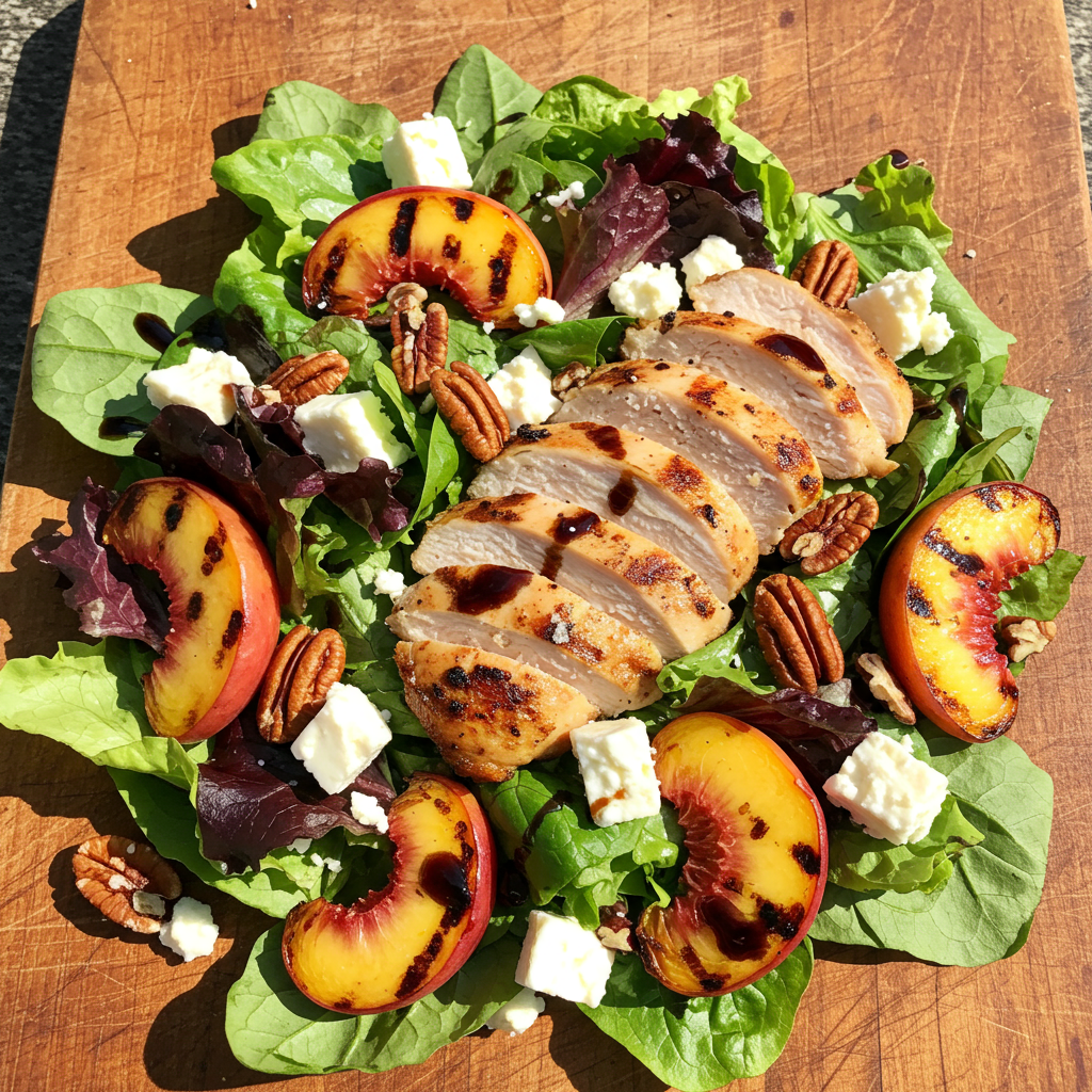 - Assemble salad: Toss greens with grilled chicken peaches feta and pecans. Drizzle with balsamic glaze.
