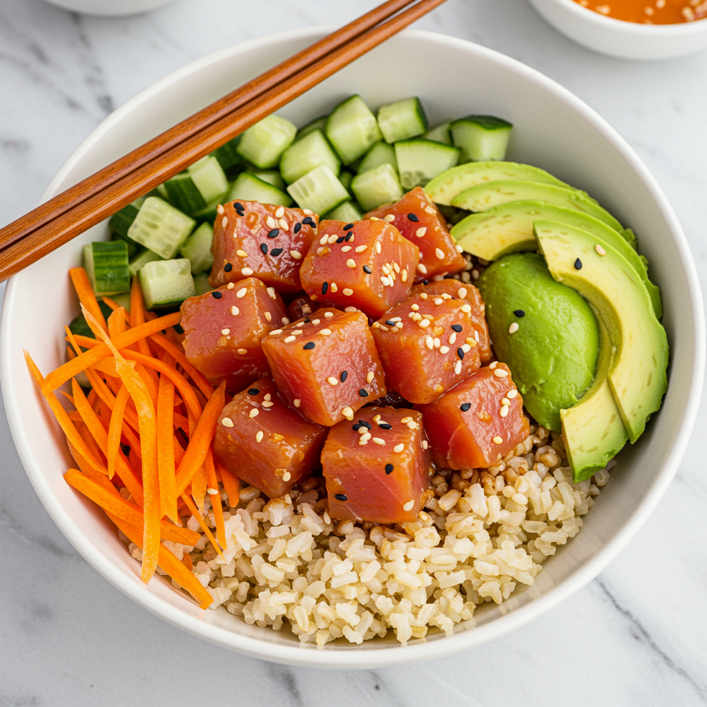 - Assemble bowl: Layer rice tuna avocado cucumber and carrot.