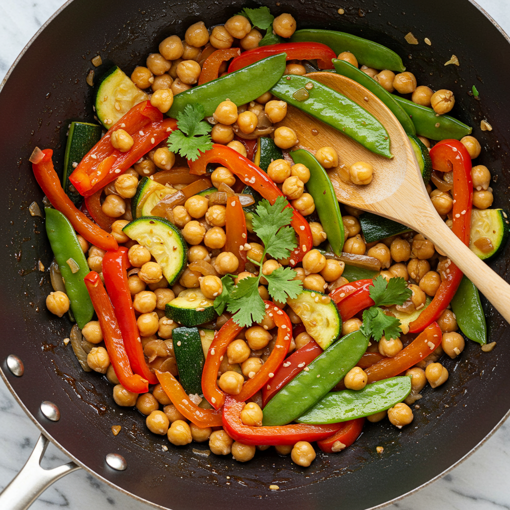 - Toss in chickpeas: Add chickpeas soy sauce honey and chili flakes. Cook 2 more minutes.