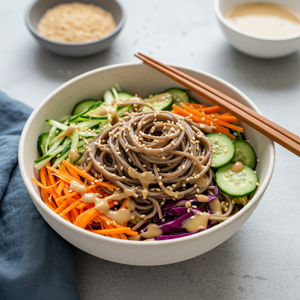 - Cook noodles: Boil soba noodles per package instructions then rinse under cold water.