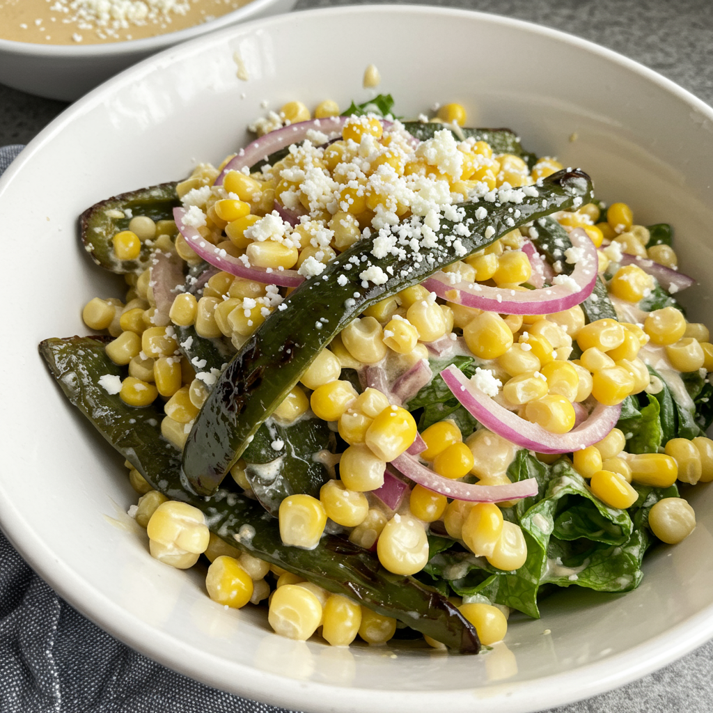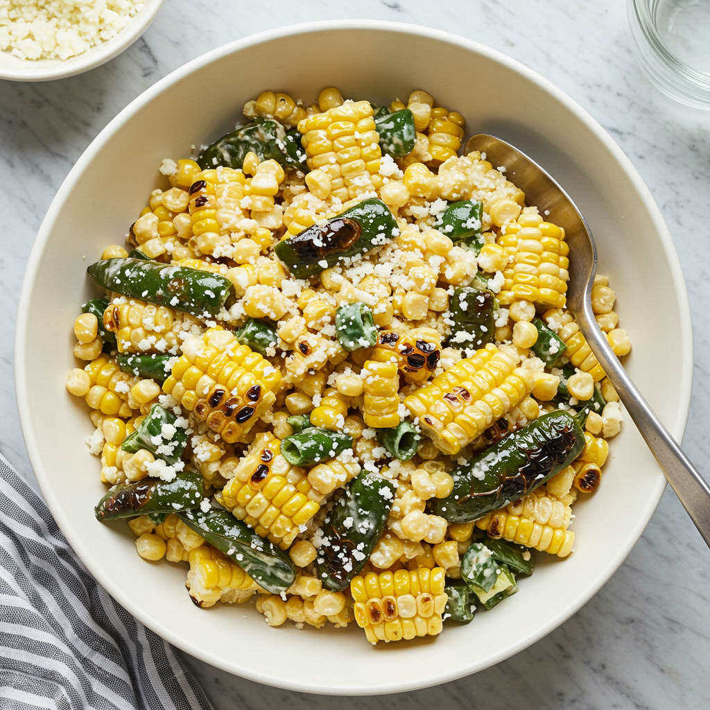 A smoky creamy salad featuring charred poblano peppers and sweet corn.