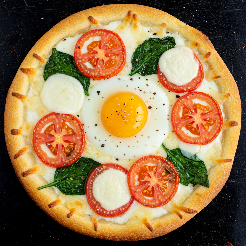 - Top with cheese, spinach, tomatoes, and crack an egg in the center.