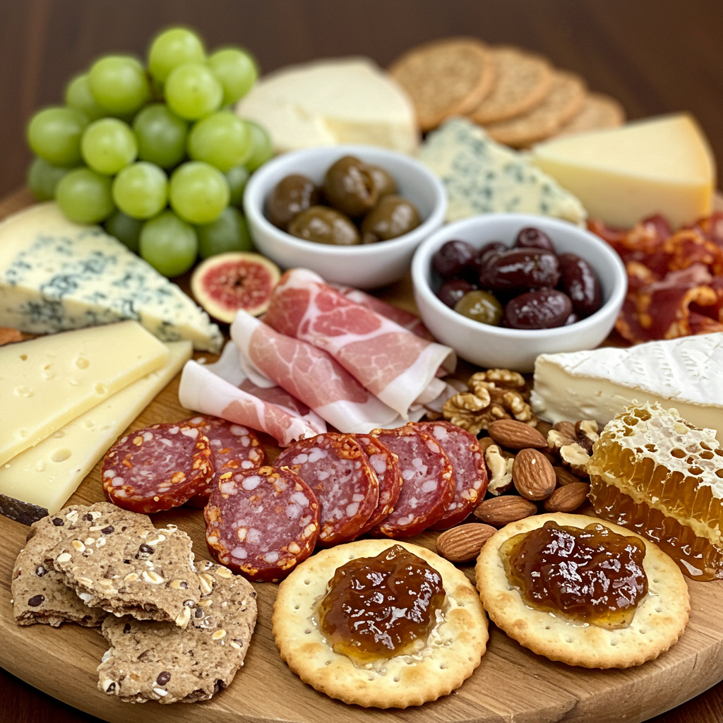 • Arrange meats cheeses and accompaniments on a board.