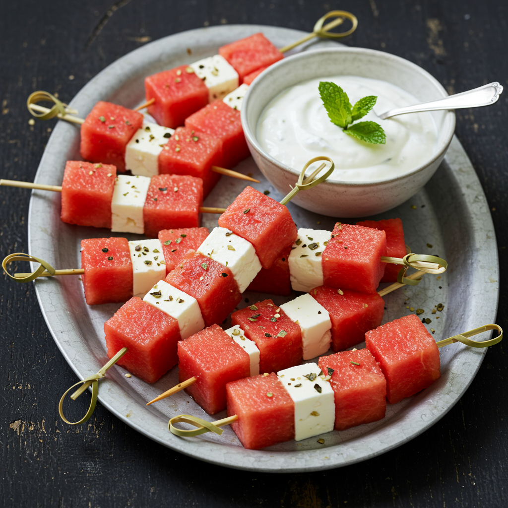 6. Watermelon Feta Skewers with Mint Yogurt Dip